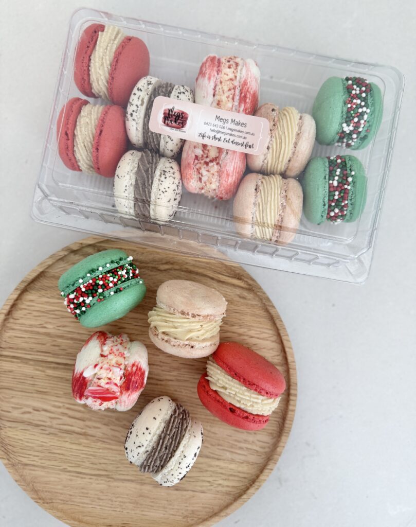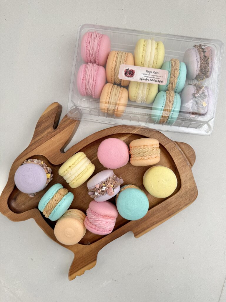 Megs Makes macarons are a sweet little biscuit of perfection using the Italian Meringue method. They contain Almond meal, icing sugar, egg whites and a sugar syrup. Macaron shells are Gluten Free.