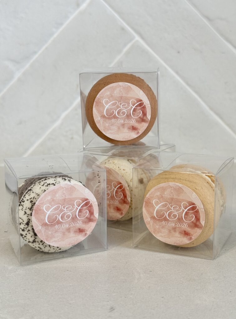 Custom macarons presented in a square acetate box with customised sticker (optional)